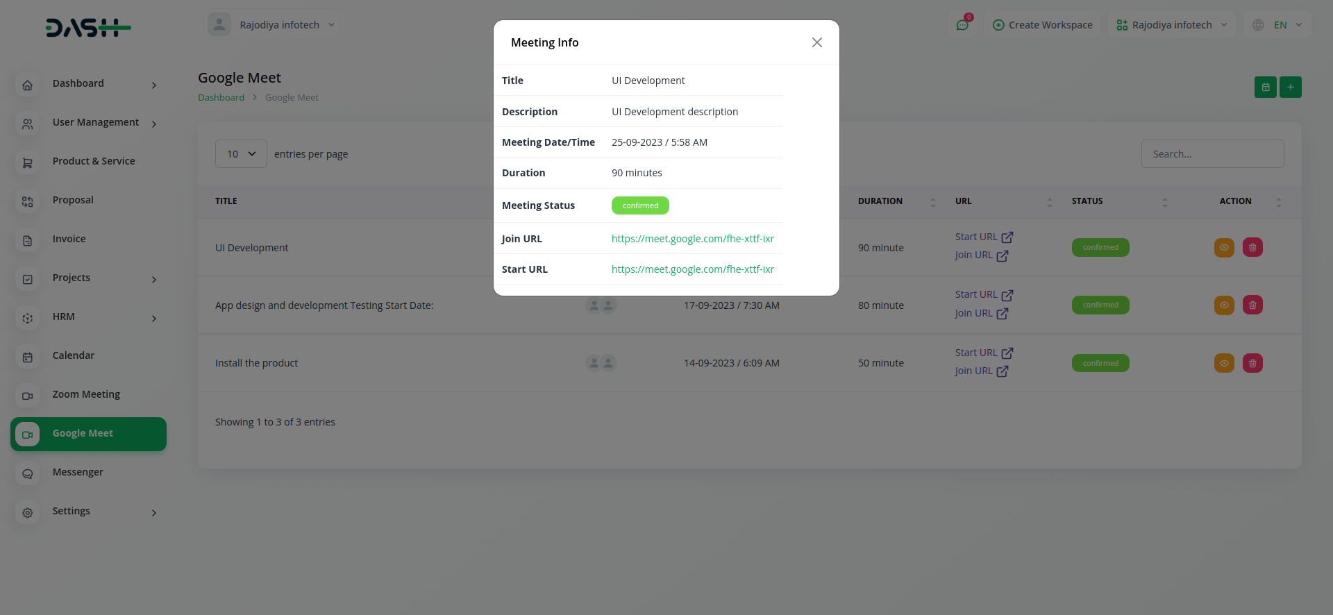 Empower your team with the ability to create and schedule Google Meet sessions instantly from within Workdo-Dash. Simplify your virtual meeting experience by seamlessly generating Google Meet links, enhancing team collaboration and communication.