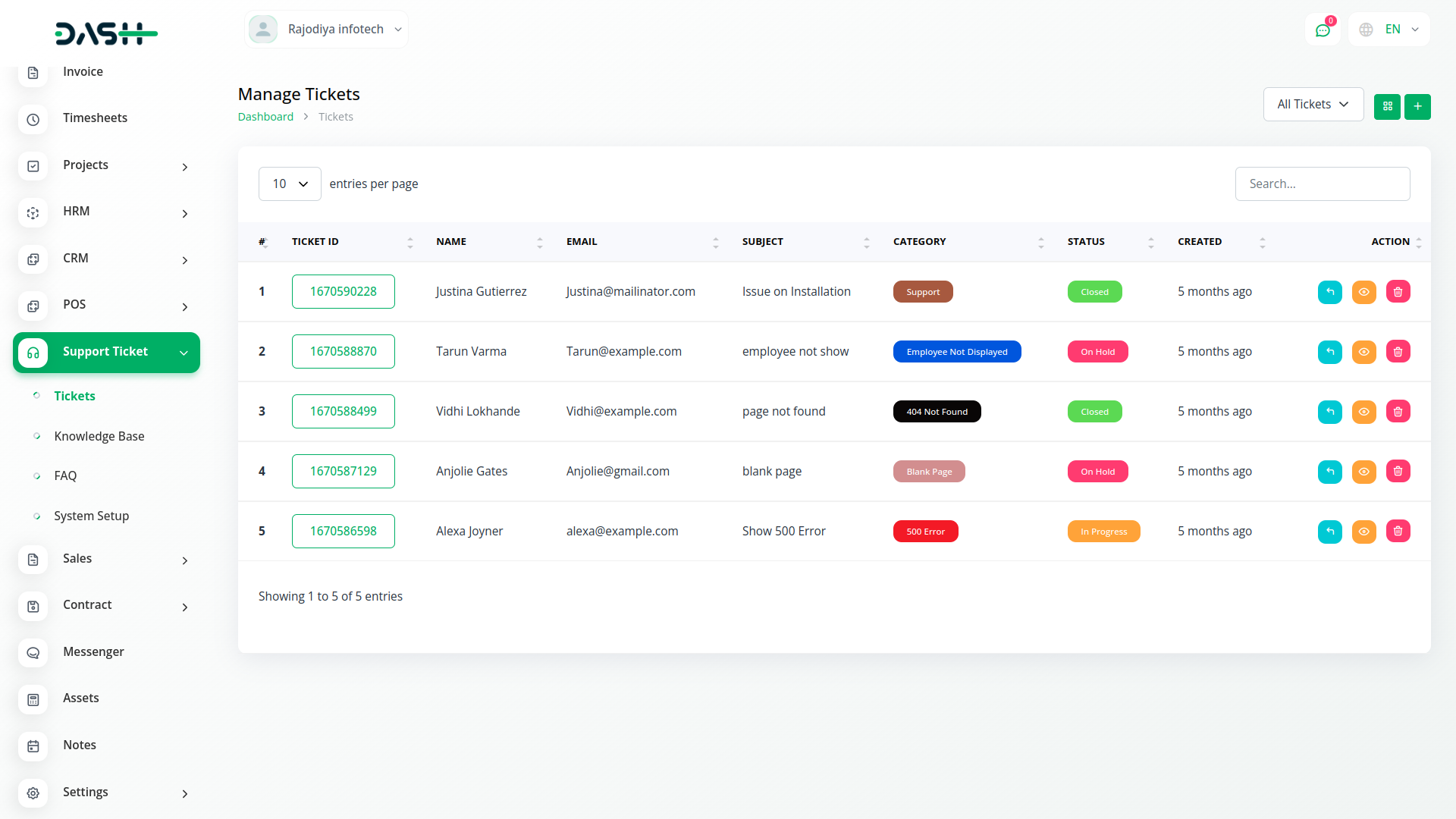 Add new tickets as and when required. Get a detailed list of all the generated tickets with their respective ticket IDs, categories, subject, status, and essential information. Edit them by adding a new response or changing the status with a simple click.
