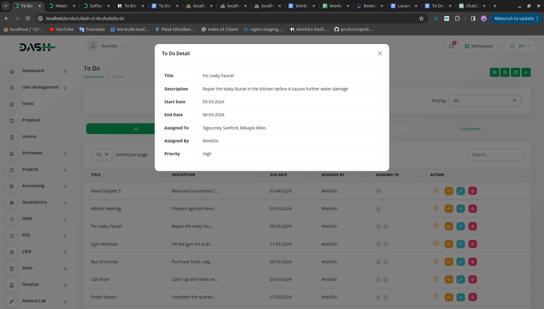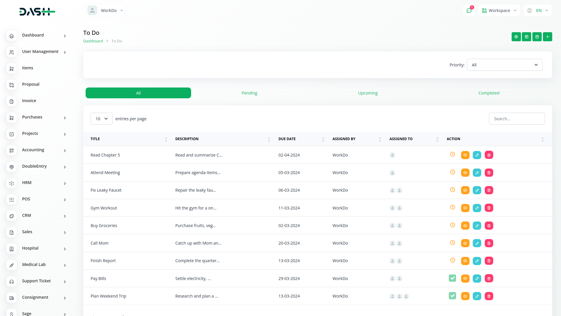 Simplify task management with Dash SaaS's ToDo module. Create, assign, and track tasks seamlessly, customizing stages to monitor progress effectively. From ideation to completion, streamline your workflow and ensure tasks are completed on time with intuitive tools that prioritize efficiency.