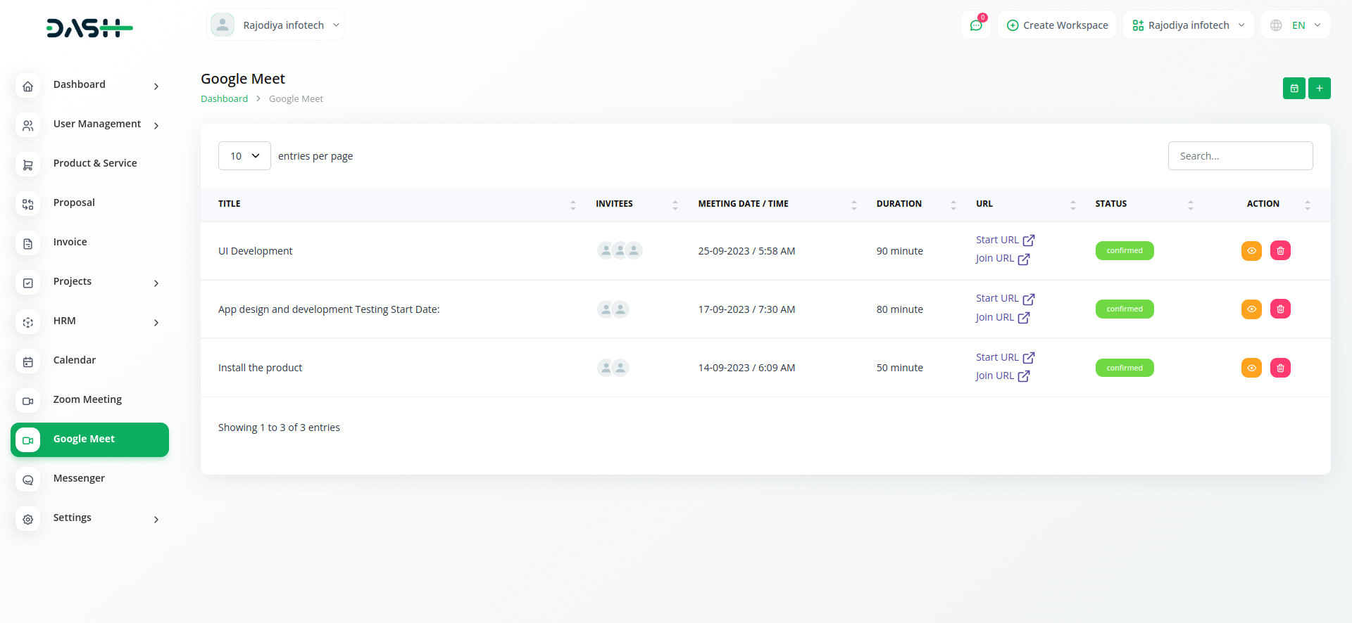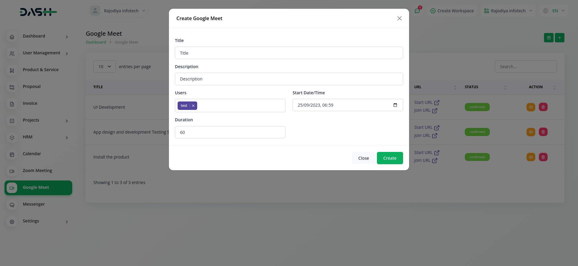 Empower your team with the ability to create and schedule Google Meet sessions instantly from within Workdo-Dash. Simplify your virtual meeting experience by seamlessly generating Google Meet links, enhancing team collaboration and communication.
